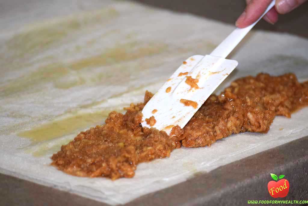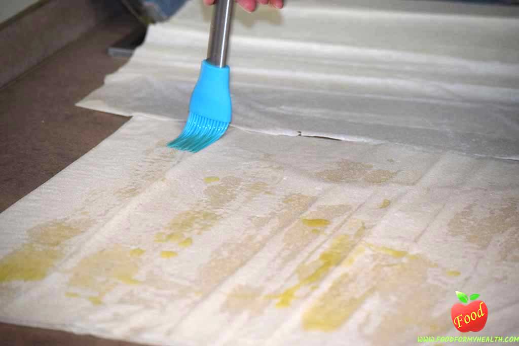 - Grease each sheet with olive oil between and on the last 3rd sheet put the apple filling in 1” line and role the pastry.