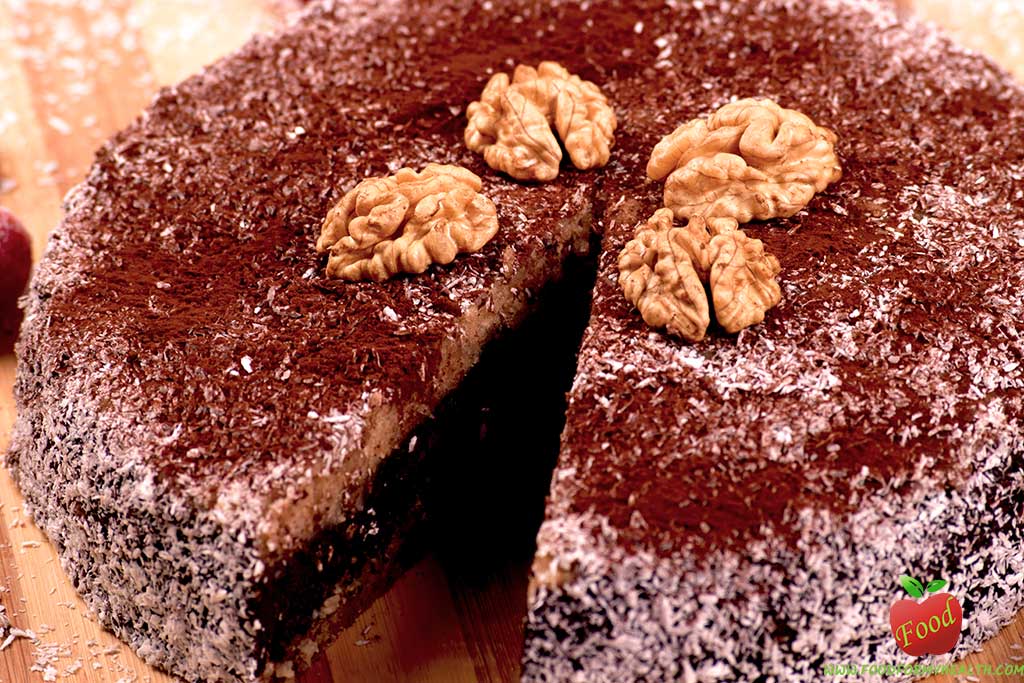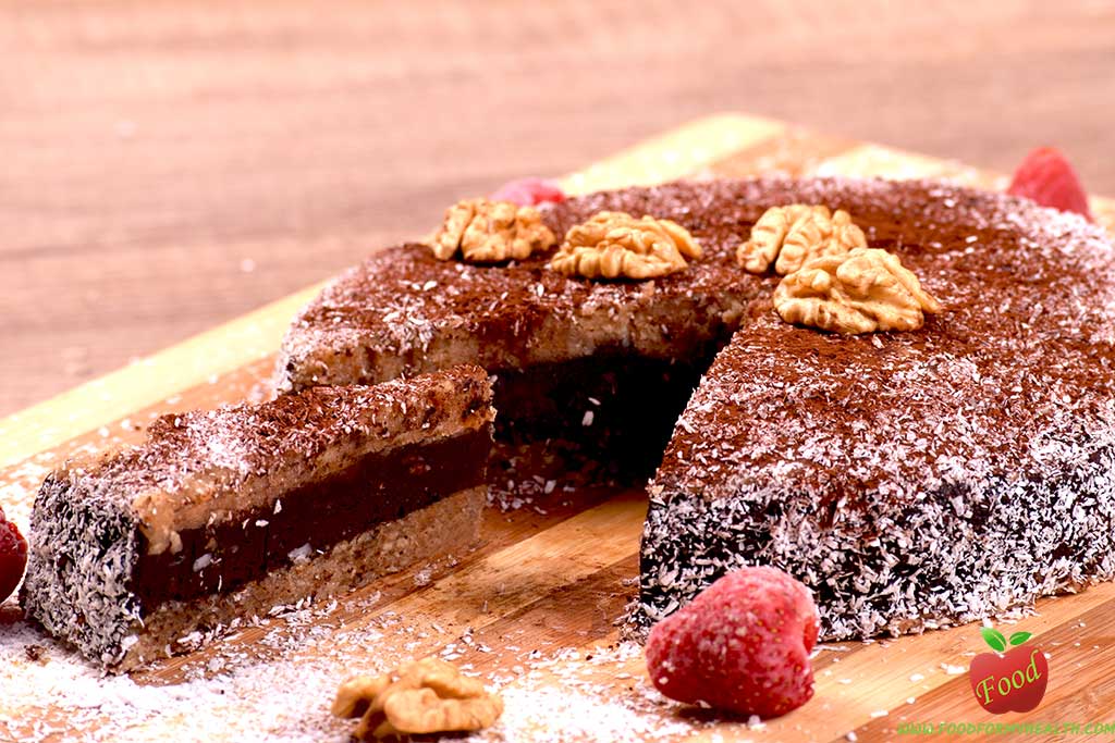 This vegan chocolate hazelnut cake is just sweet enough, and has a big chocolate flavor with hints of nuts. Coconut oil is the magic ingredient that solidifies the filling when chilled, but still melts in your mouth. It contrasts beautifully with the crispy, nutty crust, and the cocoa filling between. The taste feels like eating a dark chocolate with crunchy nuts, it is simply delicious and at the same time nutritious and healthy.