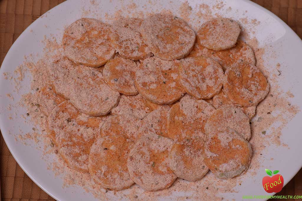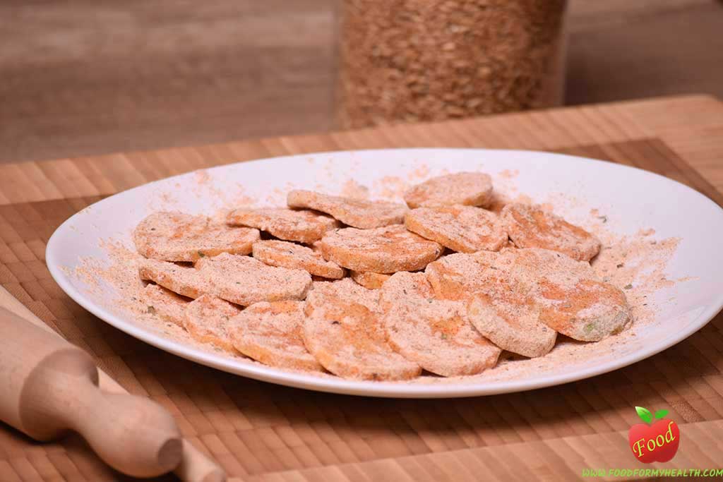 - Coat each zucchini in the mixture on both sides, shake off the excess and put on a plate.